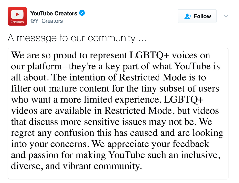 "We are so proud to represent LGBTQ+ voices on our platform--They're a key part of what YouTube is all about. The intention of Restricted Mode is to filter out mature content for the tiny subset of users who want a more limited experience."