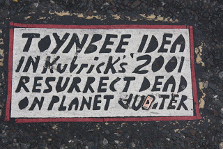 So what do the tiles mean? Although we may never know for sure until the creator comes forward, Max Rivlin-Nadler's article The Reappearance of The Toynbee Tiles: What Does It Mean, found on gothamist.com, elaborates that the reference to Toynbee can either relate to writings of Arnold Toynbee or "The Toynbee Covector", written by Ray Bradbury. From there it has been found that Toynbee ideas may have to do with the plausible fact that real resurrection is capable both on a religious and scientific level.