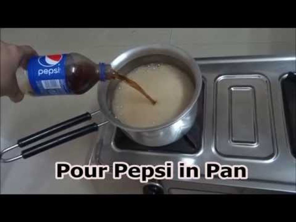 In this experiment done by Rajnikant V/s CID Jokes, Pepsi is boiled down until all that if left is a black sludge-y goo that looks like it belongs in a B-rated horror movie. As you watch the video, the captions keep saying that the goo looks and smells like Coal Tar.For those that don't know, coal tar is used to treat many skin conditions including psoriasis. The substance has such a high chemical composition that the National Institute for Occupational Safety and Health (NIOSH) has sent a "safe" daily exposure limit to 0.1 mg/m3 of coal tar per 8-hour work day.