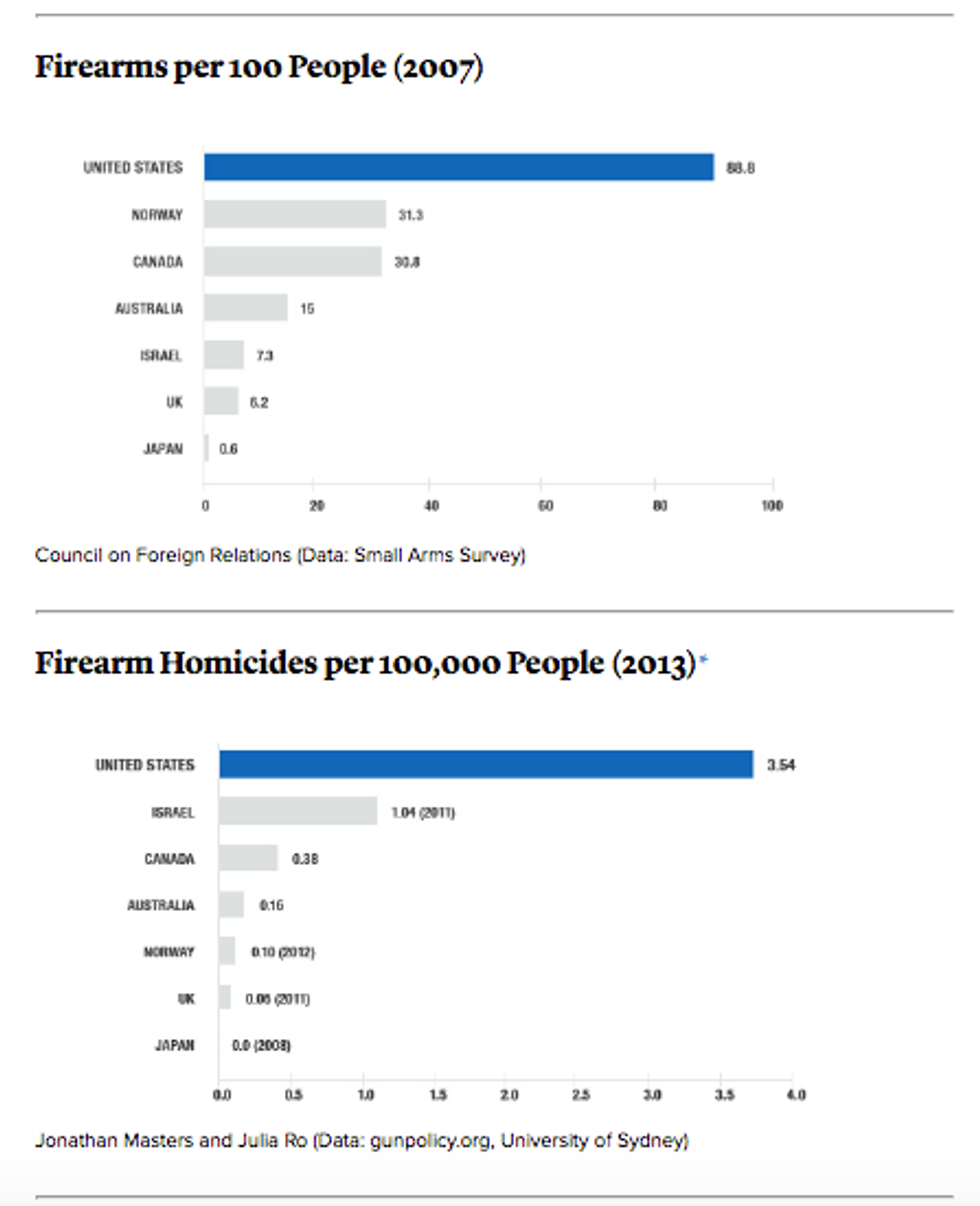 To put this in more perspective, according to a 2007 report by the Switzerland-based Small Arms Survey, America approximately composes of 5 percent of the entire world's population and has 35-50 percent of the world's civil owned guns. The U.S. also has the highest number of firearms per capita. To top it off, out of all the industrialized countries in the world, America has the greatest homicide by firearm rate. Correlation may not prove causation; however, I hold these truths to be self-evident, and to underline a fact that we cannot otherwise ignore: America has a gun problem, and like all other addictions, requires serious detoxing.