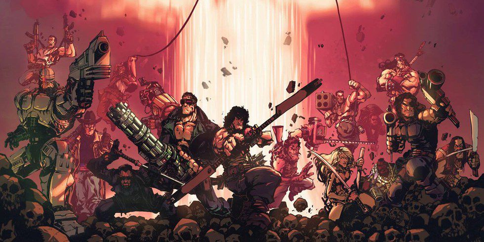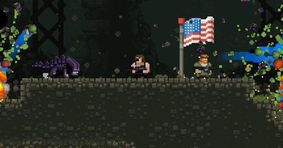 Game developer Free Lives, alongside publisher Devolver Digital, have crafted a glorious homage to the bygone era of pixellated, side-scrolling Run-‘n’-Guns that colorfully explodes the possibilities of the classic genre and style. The guys behind the Hotline Miami series and (most recently) Enter the Gungeon seem to know exactly what they want in a game and the fertile ground of video-game history to tap into to. It’s no wonder they spotted up-and-coming game jammers, Free Lives, and threw money and expertise at them. They’ve taken the classic style of Contra and Metal Slug and mixed in the all-stars of '80s and '90s action-film history. Rambo, Ellen Ripley, Mr. T, John McClane, Snake Pliskin, Robocop, Neo, Judge Dredd and of course Chuck Norris are just a few of the names (all turned into “bro” puns in-game e.g. “Rambro”) appearing in this game.