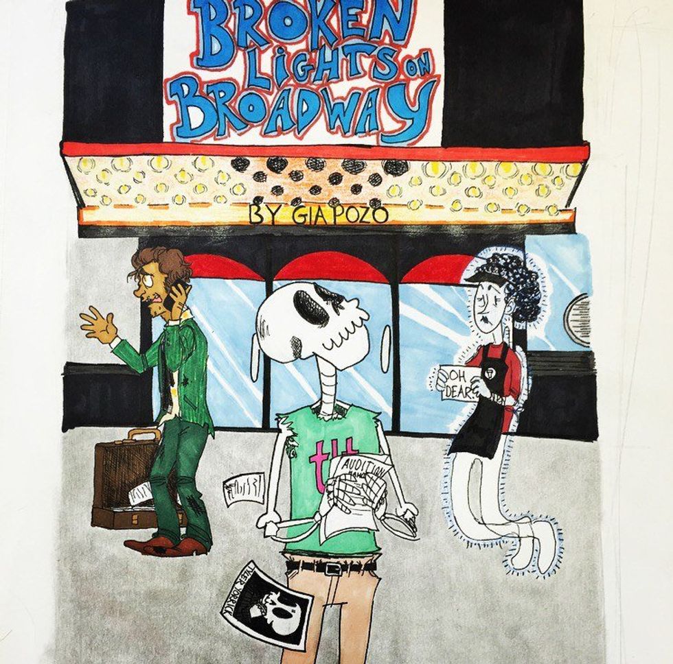 On May 23, 2016, Arthur L. Johnson High School opened their annual art show. The biggest draw to the event is when the senior students of art programs get a section to show their work. As I wandered among the sections my eyes were drawn to the display of Gia Pozo. A dear friend of mine, she has had a long and successful year so far. She has been major roles in both the play and musical, won an award for her lead in the play, and was accepted into her first choice school the School of Visual Arts in New York City for animation. What else could she have done? Oh wait, she is releasing a new comic series today. Gia has been working on her first edition of her original comic "Broken Lights on Broadway" as the final presentation of her senior year. A story focusing on a skeleton with a dream, to break into the world of Broadway. I picked up my copy and waited until I reached the comfort of my home to flip through it at my own leisure. Once I did I was amazed; I felt this was something that needed to be spread around. So what better way than to write a review.