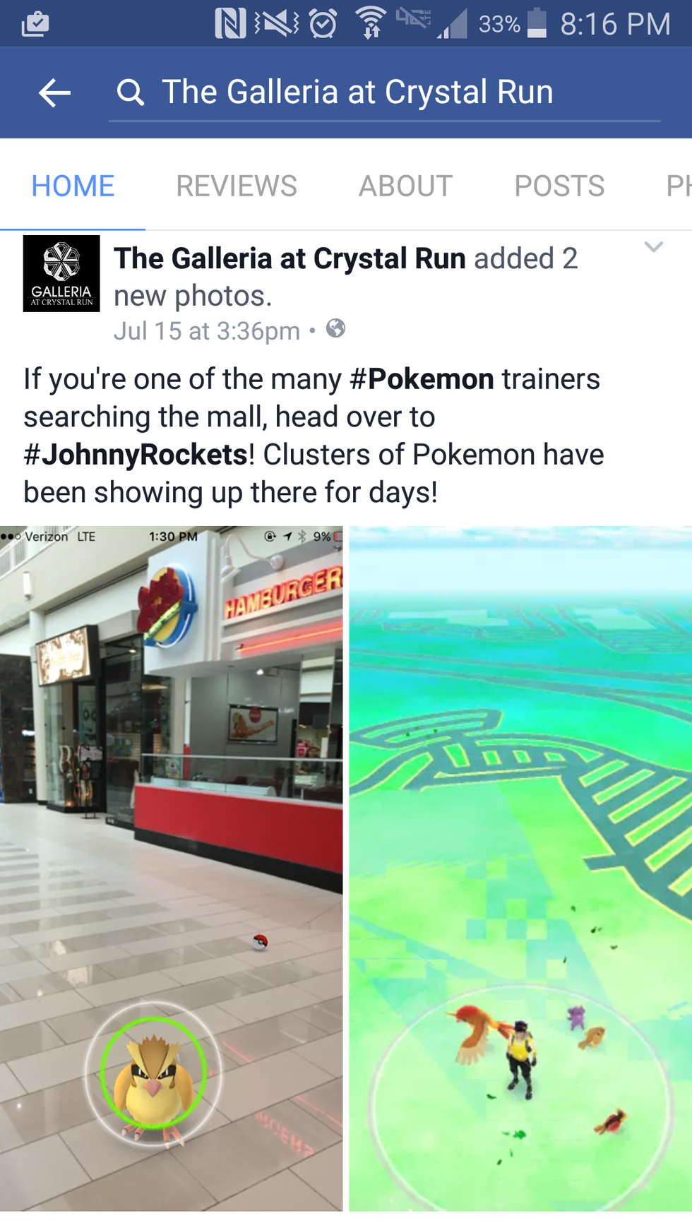Pokémon Go is a single or multiplayer game on the App Store for Apple and GooglePlay for Android that has taken the world by storm and has already surpassed ten million downloads within its first week of being released! Pokémon Go is an animated game that allows you to interact with the real world while still looking at your phone screen. As seen by ratings on the Google Play Store, Pokémon Go is a game that can allow you to interact with the real world around you. It is also a great way to kill time and it is seen as a great excuse to get out of the house. Pokémon Go was built with Niantic’s Real World Gaming Platform and uses real locations to encourage players to search anywhere and everywhere for Pokémon. Friends even go on adventures together to search for Pokémon. On Facebook, Twitter, and other social media sites, businesses can also use Pokémon Go as a business antic as shown by the Galleria Mall at Crystal Run post on Facebook.