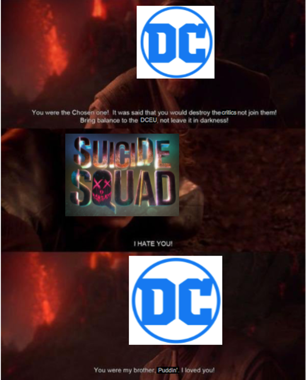 In conclusion, I can describe my feelings about this film in this analogy: It's the end of the lightsaber duel between Anakin Skywalker and Obi Wan Kenobi in Episode Three of Star Wars. Suicide Squad is Anakin on the bottom of the hill, his legs cut off and his entire body on fire, screaming in agony and fury. D.C is Obi Wan, having the higher ground, calling down to him in anguish. "You were the chosen one, Deadshot!" D.C cries, tears streaming down his face. "It was said that you would destroy the critics, not join them! You were to bring balance to the Extended Universe, not leave it in darkness!"