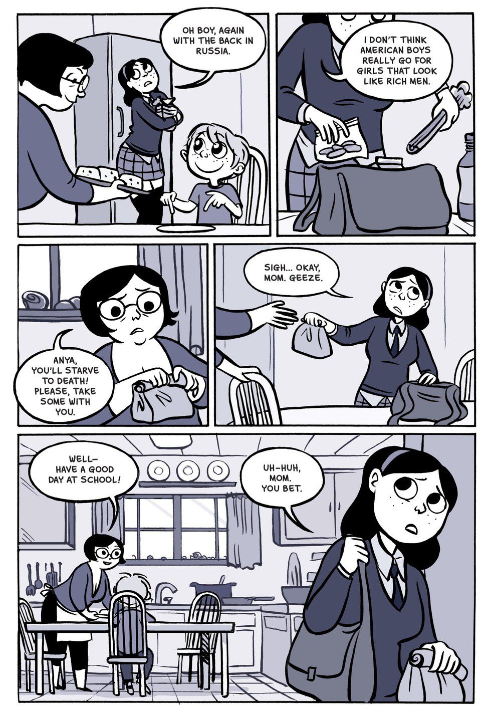 At the heart of the story is Anya herself. She’s one of the most fully realized characters I’ve come across in a one-shot comic in a long time. There’s very little time to get to know her before the story begins, but her thorny attitude and her insecurities quickly humanize her. Perhaps it’s the snarky personality I pictured Vera Brosgol having based off of my friend’s anecdote that drew me so quickly to Anya or maybe it’s sympathy for her Russian roots since my girlfriend’s family hails from the Soviet Union. Five minutes of research after finishing the book led me to the conclusion that Anya might be an author surrogate because Brosgol is a Russian immigrant herself.