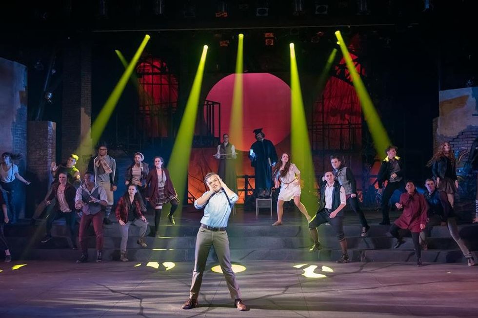 There were moments where Clarson’s choreography detracted from the principal characters’ stage business. Similarly the vocal ensemble struggled to work on dynamics, singing loudly while select performers were singing solo lines. While the “teenagers” in the ensemble were wearing red, black, and gray clothing associated with 90’s grunge, the two adult characters (played by Jeff Drushal and Amanda Hayter) wore period attire associated with the original production. Whether or not this was an intentional design choice, most first-time audience members may be confused by the contrasting attires.