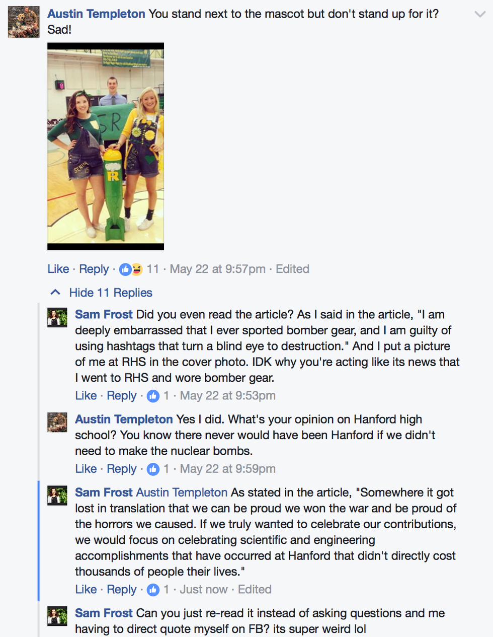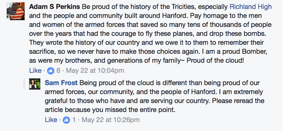 Some thought I was anti-Hanford and against those who work there. Hanford has done a lot of amazing work. However, I do not think we should glorify an atomic bomb by making it into a mascot. I never said that Hanford or the people at Hanford are bad. In fact, I said, "If we truly wanted to celebrate our contributions, we would focus on celebrating scientific and engineering accomplishments that have occurred at Hanford that didn't directly cost thousands of people their lives."
