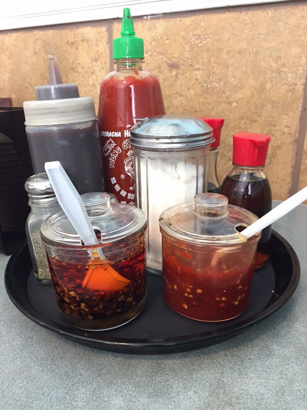 The next logical step would be the main course, which is when you're going to be knee deep in a steaming hot bowl of pho. For those that aren't familiar with this Vietnamese specialty, pho is a beef broth-based soup with rice noodles, cuts of beef, and some scallions. Almost all pho places provide additional toppings to put in (some are pictured below), such as Sriracha, hoisin sauce, limes, and hot oil. Put as much or as little of you want and then stir heavily.