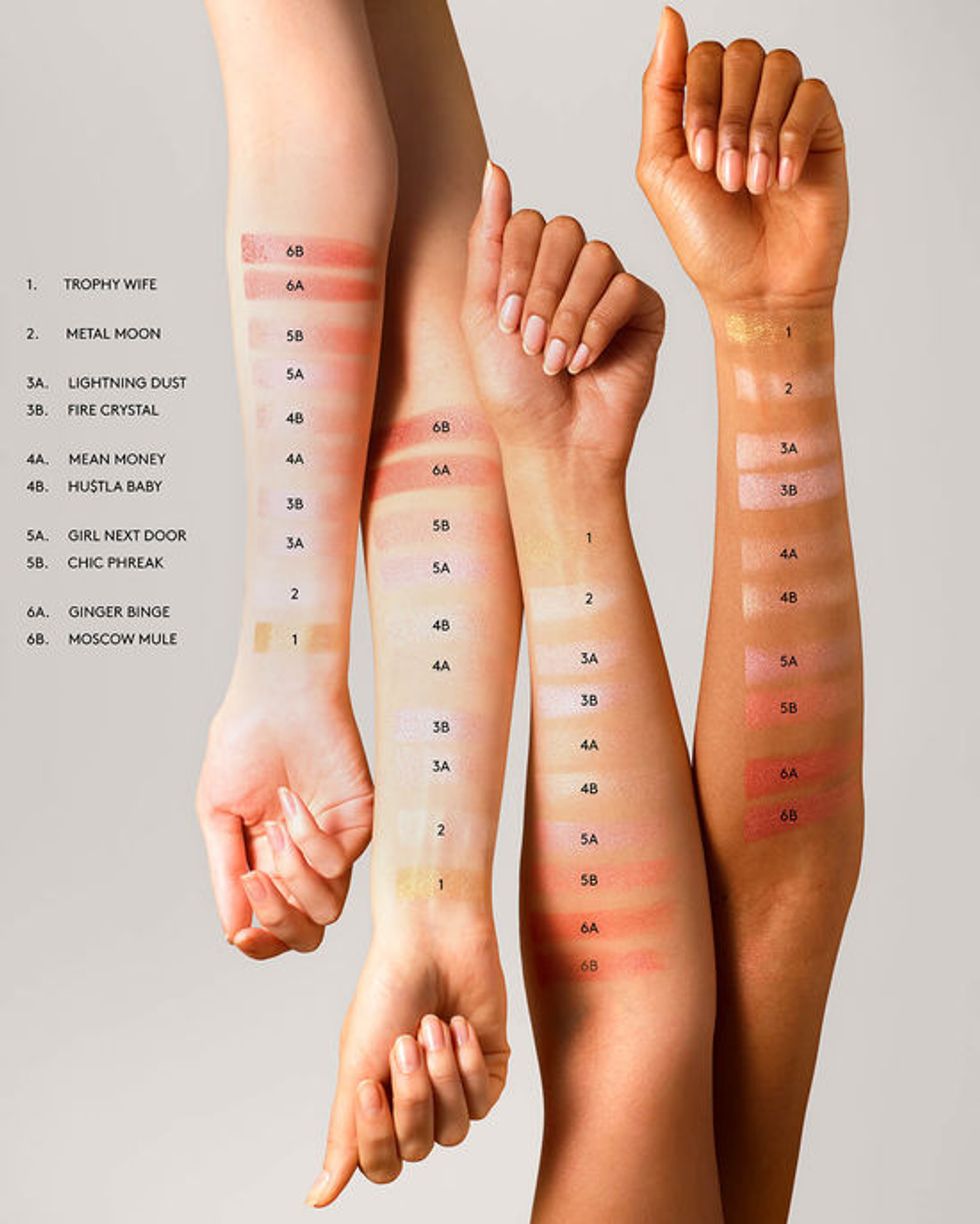 These highlight duos come in six different compacts with 10 distinct shades. Each contains 2 pans of .12 oz; however, two are a single pan compact and not a duo- a .28 oz pan. Each duo comes with a shade with a light sheen and then a corresponding one with a blinding, metallic shimmer. The single pans are probably the most coveted shades- Trophy Wife, a blinding, glittery true gold, and Metal Moon, an iridescent, icy white, gold. The four duos are all pinky/peachy tones. This formula is a cream-to-powder finish so it will glide on smoothly and hide texture rather than extenuate.