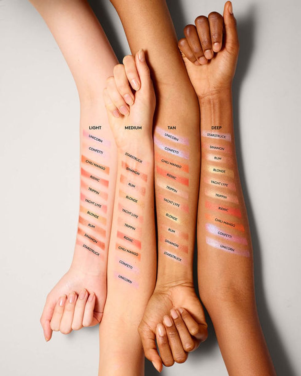 These cream to powder shimmer sticks are quite the stunner. It is .25 oz. There are 10 shades- 6 "natural" shades so there is one for every skin tone, and 4 fun shades. These can be applied directly on to the high points of the face to highlight, to the lips, on the eyes, or anywhere you want! These multi-purpose sticks can be lightly applied, or heavily layered to get the full pow.