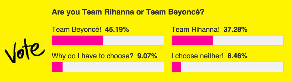 First and foremost, considering I'm judging two extremely successful singers when I can barely hum the National Anthem, the music is the most important thing and ultimately the only thing we actually do have a right in which to judge them. When thinking of Beyoncé, one usually is reminded of all the excessive (read: unnecessary) hype that goes along with her appeal, onstage and off. That being said, I think Rihanna's music is ONE THOUSAND times better than B's. 'Man Down', 'Pon de Replay,' 'You Da One,' 'Unfaithful,' 'Breakin Dishes,' 'S&M,' 'Hatin On The Club,' 'Cockiness,' 'If It's Lovin That You Want,' 'What's My Name,' they are literally all such jams I can't even begin to express it enough.