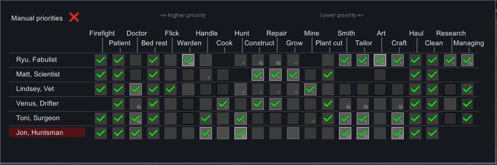 This game allows you to customize jobs specifically within your colony, allowing the most efficient run. It also shows which jobs each colonist is more skillful in (the bright boxes) as well as allows you add Manual Priorities, which gives you tiers of importance.