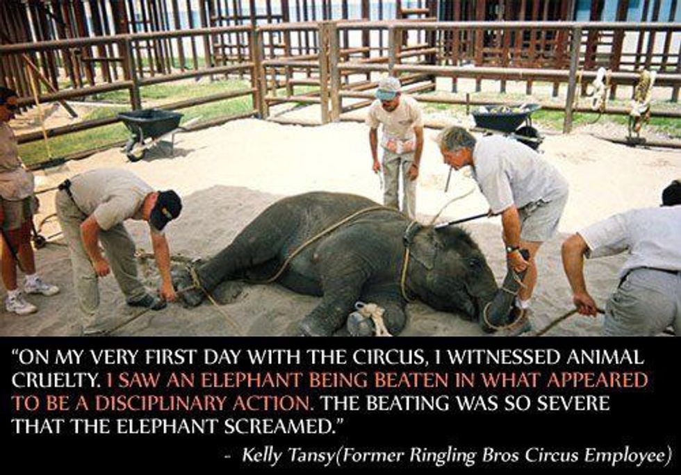 We've all seen the pictures, the elephants standing on tiny pedestals, or standing on two legs with decorative ladies on their backs. They have jewels and blankets draped over them, big red circles on their foreheads saying "The Greatest Show On Earth!" Did you ever ask yourself how exactly they trained these beautiful, wild animals to behave in such a way? They use bullhooks (sharp, metal devices that resemble fireplace pokers) and electric rods to beat, shock, and gauge the elephants.