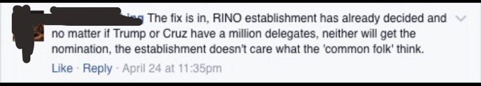 Ah, yes, he managed to incorporate another one of those delicious, perfidious slanders that has garnered equivalent status. The "establishment" vs. "outsiders." Washington vs. The People. Son of Krypton vs. Bat of Gotham. Indeed, darn that pesky establishment. Who do they think they are with their resumés, degrees, accolades, and elected positions? They would never be able to adequately and informedly vet a more qualified candidate within their power than mob rule could. Surely they've spent so much time doing the thing they spent their entire education building up to with little avail that it all must be exclusively their fault! Well, not exactly so. Though it is unquestionable that our Congress and President have failed us in numerous areas of import, it is, in many ways, the fault of the electorate at all levels as well. The incapacity to value politics and discussion over principle is actually more conducive to the same failed politics that have caused political stagnation. This is why we see things like this: