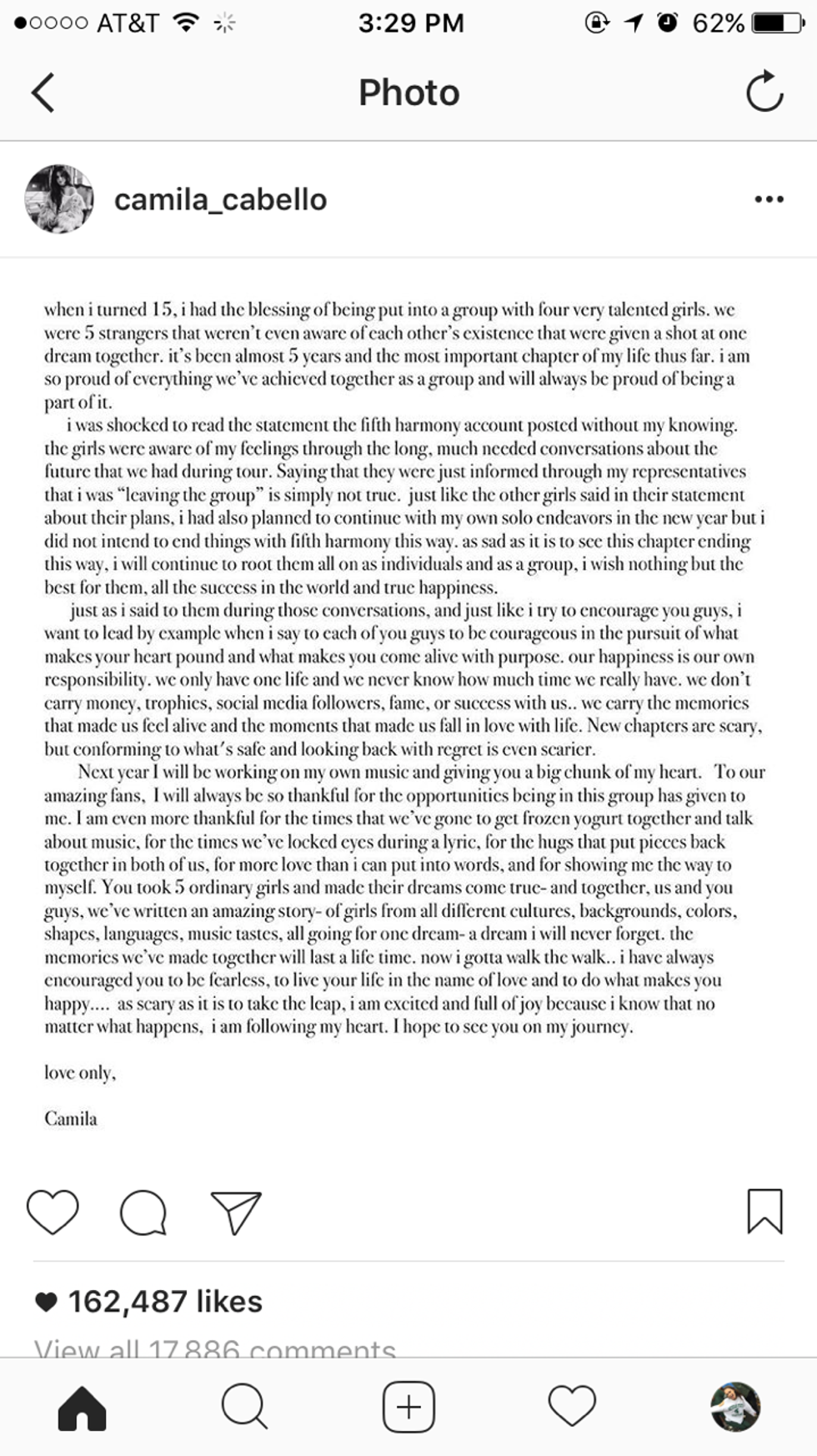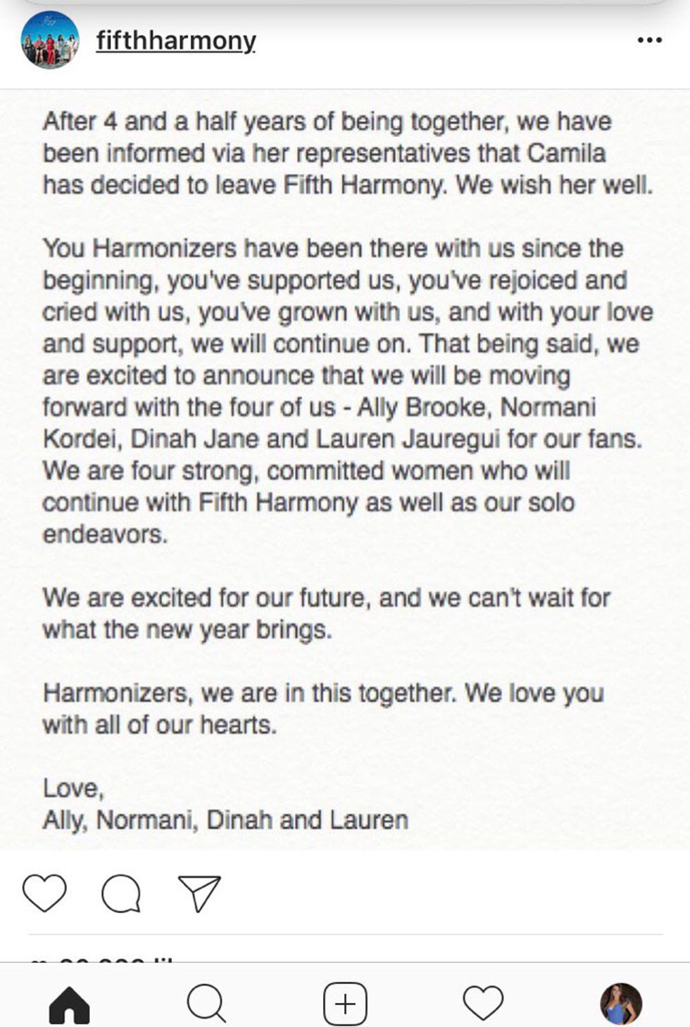 This news hit the fans hard - Twitter and Instagram were taken over by fans questioning Camila's sudden exit from the band. Camila responded with an Instagram post herself that stated: