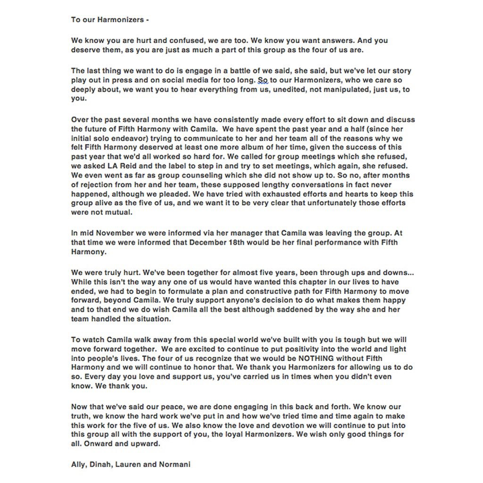 This left fans and the rest of the girls in the group stunned. Here, we are receiving two different sides to the story with very different information depicted on each side. Following Camila's post, Ally, Normani, Dinah, and Lauren responded again.