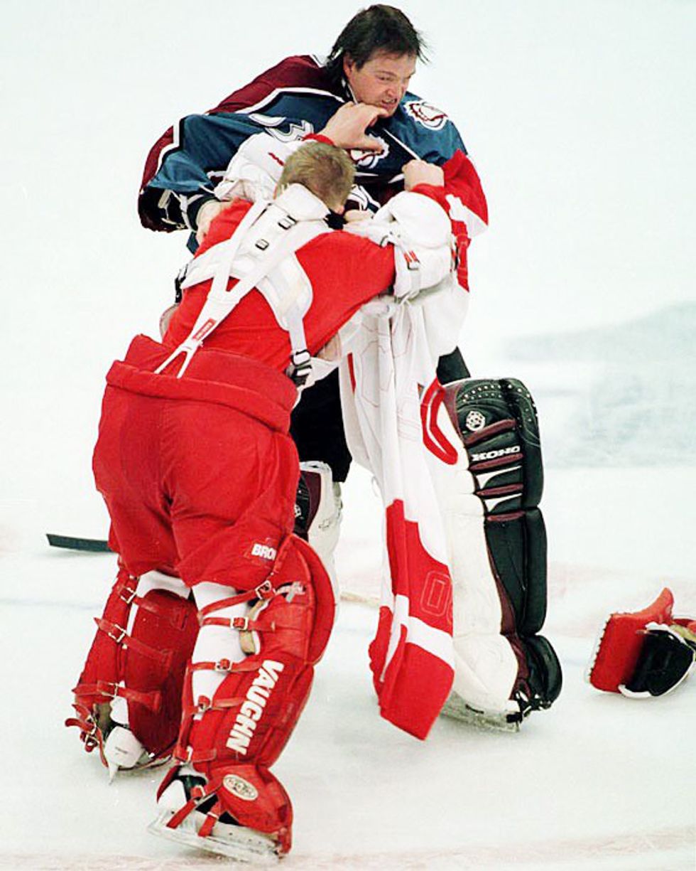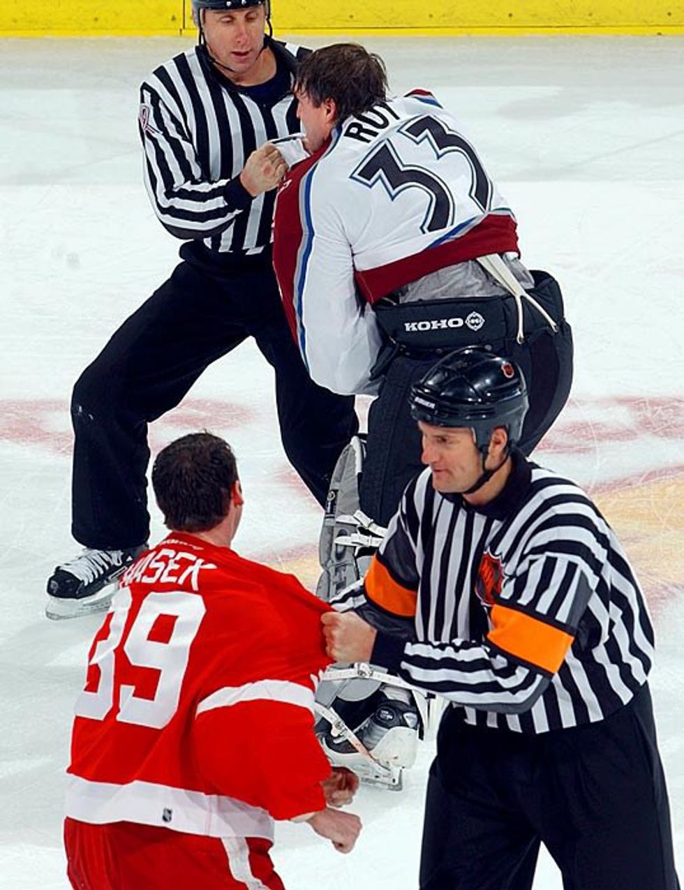 In 2002, Red Wings player Kirk Maltby flew into Patrick Roy’s net and Roy was not happy about it. Red Wings Goalie Dominik Hasek took off skating down the ice to confront Roy but tripped on a stick that caused him fall and knock over Roy. Sad part is Roy and Hasek were both restrained by officials preventing Roy to fight with a third Red Wing goalie since 1997. How cool would it have been to see Roy fight three Red Wing goalies? Um, freaking awesome.