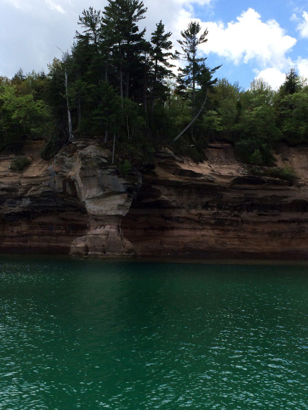 The weather forecast had been ominous that morning, threatening thunderstorms all day. Somehow, we got lucky and didn't run into any bad weather! Quite the opposite, actually; the sun shone brightly as my dad and I hiked to Miner's Castle and other Pictured Rocks overlooks. The water was a stunning bright green at the shore and extended farther out into the lake, where it turned a royal blue. With the promising weather conditions, my dad and I got onto the Pictured Rocks Boat Tour. Our captain was quite the jokester (and he had the thickest Canadian accent, ha), sarcastically commenting on the "busy and fast-paced life of Munising" (it's actually the calmest little town) and the high speed of our boat's engine ("a whole, whopping 13 miles per hour!"). We passed Grand Island and noted the church-shaped lighthouse and lack of electricity found in the residencies. When we saw Munising's local high school, our captain remarked, "...and this is our local prison house: it holds around 200 high schoolers annually from September to June." We got a good laugh from that one!