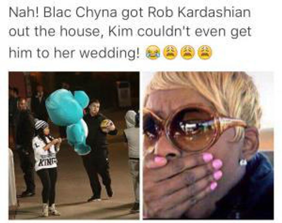 Growing up in a technology generation, you tend to see a lot of stuff on the internet that should be handled behind closed doors. The most recent celebrities to air their dirty laundry are Robert Kardashian and Blac Chyna. She allegedly only planned to be married or with him for about a year. According to Robert's SnapChat, Chyna took the baby, all their stuff, and the groceries out of their new house. Whether its true or not is neither here nor there. I wish they would handle their business in the privacy of their own homes. While scrolling through the internet, I found these memes of Rob and Blac Chyna. For some strange reason, I laughed and shook my head. I wonder when people have time to make these memes.