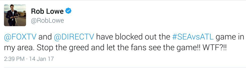 “Stop the greed and let the fans see the game!!” tweeted Rob Lowe on Saturday, angry that Fox and DirecTV blocked the Seattle versus Atlanta game. A long time actor appearing in many of DirecTV's most well known advertisements, the declaration from Lowe is bound to hurt the company, and save consumers from what many knew was already true. Satellite services are unreliable and unsatisfying to many of their customers.