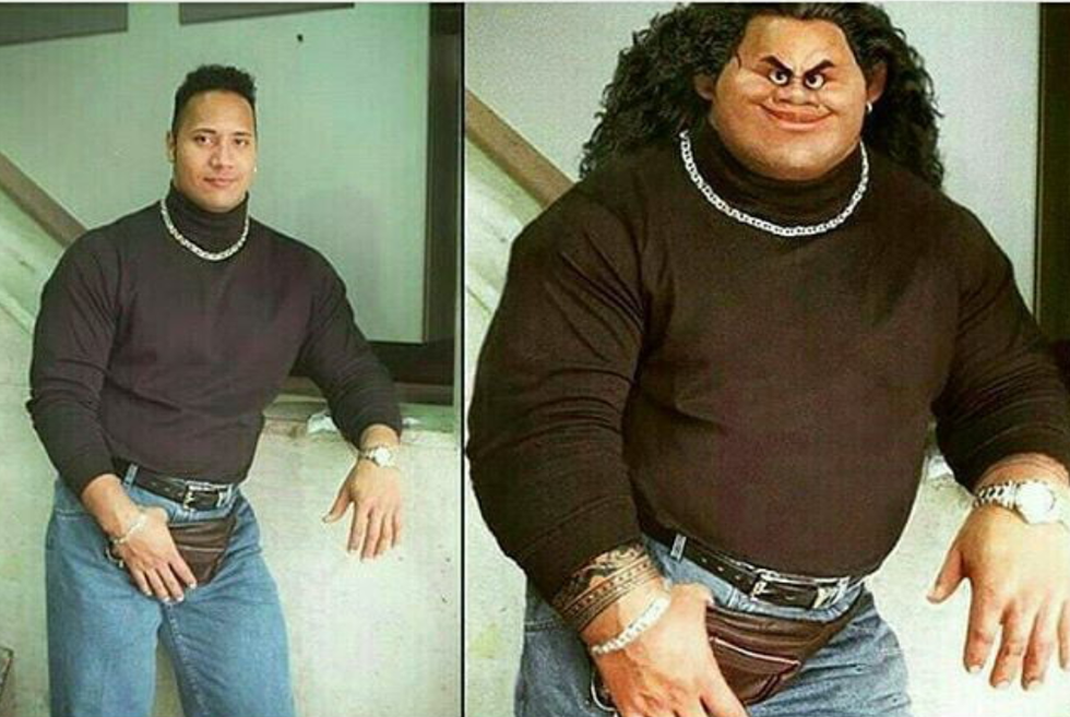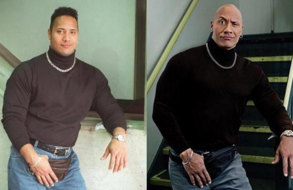 The original photo of Dwayne Johnson (Left), and the Rock (Right), who is seemingly mercilessly mocking his pose and fashion choices.