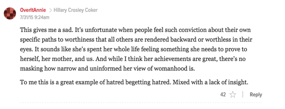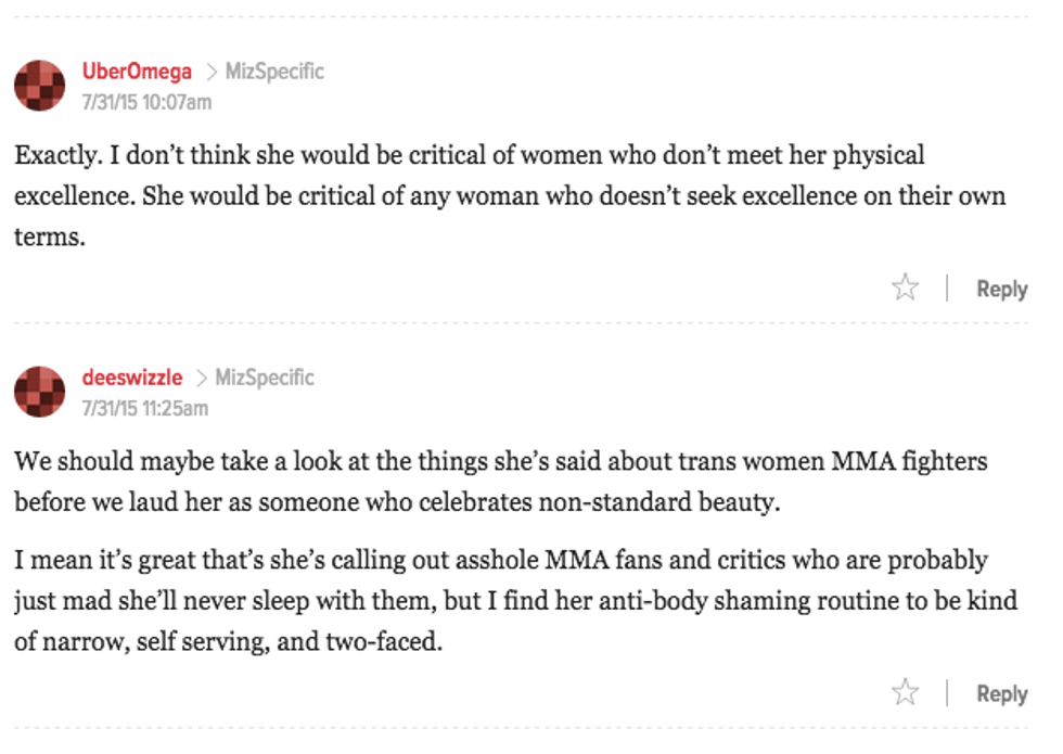 And I agree. By basically saying "I'm not like most girls," we are witnessing firsthand internalized misogyny. Rousey responded to sexist rhetoric with a sexist response. This changes nothing. This helps no one, including herself. By calling out these women with bodies, "developed for f*ng millionaires," she's adding to the misogynistic culture we see today. She's tearing other women down that don't look like her.