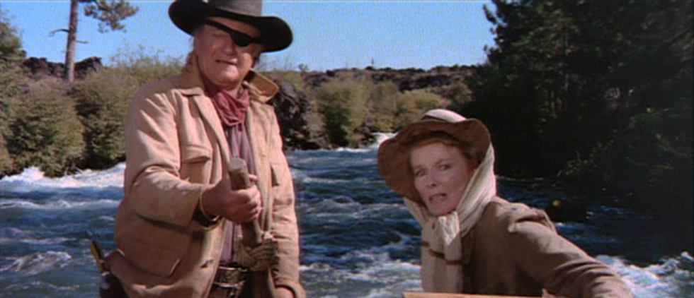 The first movie I will be dredging up is the 1975 "classic" Rooster Cogburn ( ... and the Lady), starring John Wayne (reprising his Academy Award-winning role as one-eyed U.S. Marshal Rooster Cogburn) and three-time Oscar winner Katharine Hepburn as, *gasp*, another iron-willed spinster.