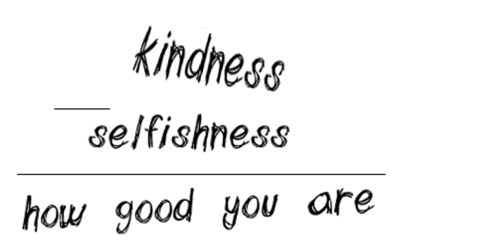 I thought about where Rosita was sleeping right now, probably a one-bedroom apartment where she didn’t even own a can opener or a flat-screen television. I nudged closer to my Dad, so close that I could feel his hot breath. I would be whisked away by him, and accompany his wrongdoing for the rest of my life. We’d be like the devil in the Bible, beckoning people forward to perform nasty tricks on them. We’d made my mother disappear. We’d made Rosita lose her job, and Vanessa have something she cared about turn blue. I had thought Rosita was trying to marry my father, but clearly, I had been very wrong, and there was something going on that wasn’t my business. So at three forty-five in the morning, I stole my father’s cell phone and walked into the kitchen. The blue buttons glowed like ghosts, and I punched in a familiar number. I had decided to call Rosita, and I had to do it very quickly before my father woke up. I had decided to help Rosita and Vanessa, although I struggle to remember the details of the conversation that followed. It was because I was crying for most of it, and felt like I was floating in outer space. I do, however, have this equation that very well explains what I was thinking