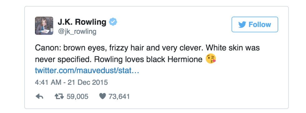 Yet, social media exploded with mixed reviews after the news hit that a black actress would be portraying Ms. Granger in the new play. The real bombshell should be that Paul Thornley doesn’t have red hair. I mean, come on. You cannot have a Ron Weasley without that red hair and freckles. Since fans know Hermione Granger as played by the white actress Emma Watson, there was some backlash at the immediate press release. However, J. K. Rowling, the author of the series, quickly shut down all the negative comments about the new look for Hermione in one simple tweet.