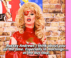 11. Katya to Roxxxy Andrews- "Roxxxy Andrews, I think about you all the time. Especially in the morning, at the bus stop. Too soon, too soon, sorry!" (All Stars Season 2)