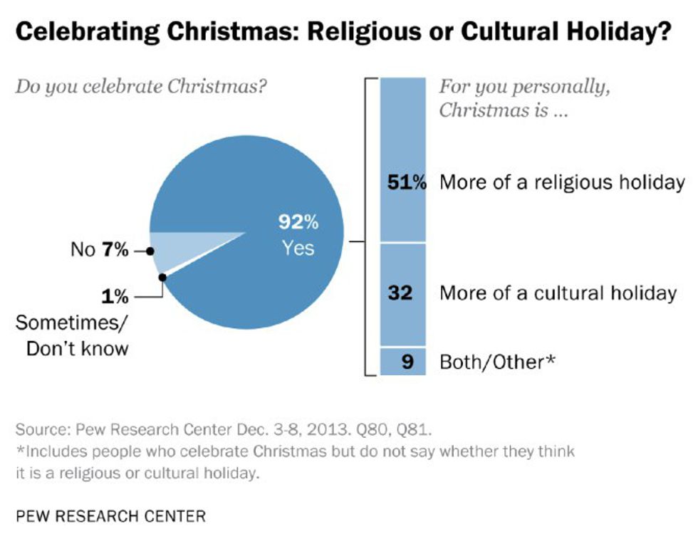 An example of taking political correctness a little too far is New Jersey councilwoman Charlene Storey, who resigned after lawmakers voted to call the New Jersey town, Roselle Park's Holiday Tree, a Christmas Tree. This infuriates me because a tree that has red and green decorations and lights on it is a Christmas Tree; no other holiday has a decorated tree as one of its symbols, so that makes it a Christmas Tree. No one would call a Menorah a Holiday candleholder because those candles are symbolic of Hanukkah, not of any other holiday. This is not a case of exclusion. Christmas now is such a secular holiday that you don't have to be Christian to celebrate it. In fact, according to a survey done by Pew Research Center that surveyed 2001 American adults, while nearly all Christians celebrated Christmas, only two-thirds view it as a religious holiday. This study also found that 80% of non-Christians that took part in Christmas said they celebrate Christmas as a cultural celebration instead of a faith-based one.