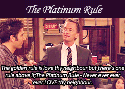 The Platinum Rule: “The Golden Rule is ‘Love thy neighbor’ but there is one rule above it: The Platinum Rule – never ever, ever, love thy neighbor.” (Basically, don’t hook up with anyone that you have to see on a regular basis).