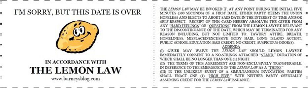 Lemon Law: Barney’s idea that, if after five minutes into a date, you know that there is absolutely no possibility of a second date, you reserve the right to leave immediately.