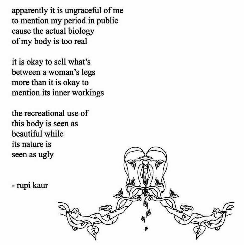 This poem is really close to my heart. As a feminist, I am always one to argue against female objectification. Many of Kaur's poems speak out about women's issues that I relate to myself, but this one, in particular, is something that I feel many women experience.