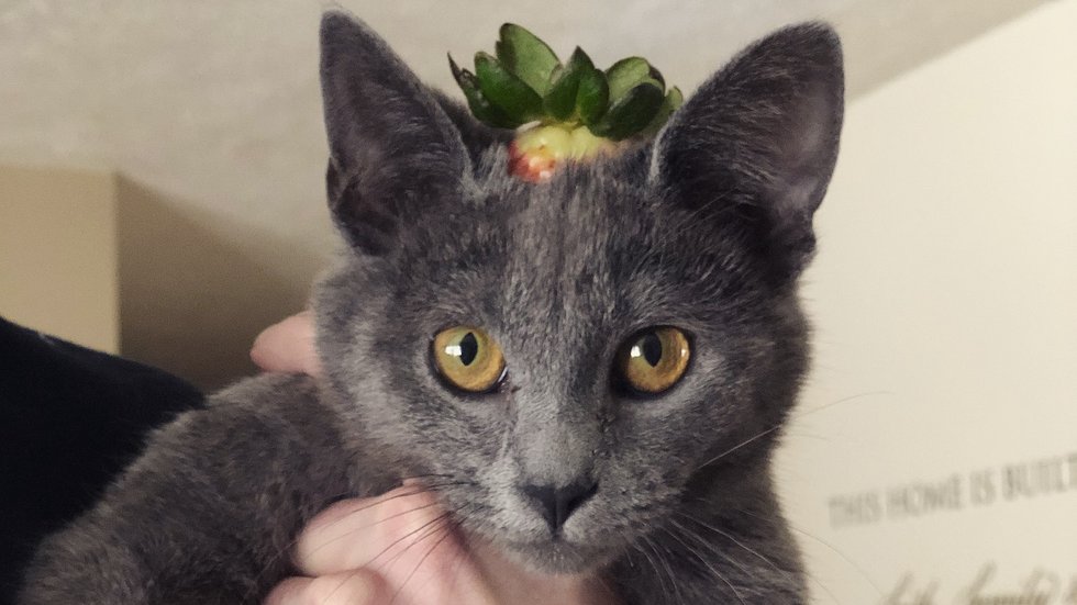 Our kitten is a five-month-old Russian Blue. The “blue” comes from their fur, which is a beautiful bluish-grey. They usually have big bright green eyes.