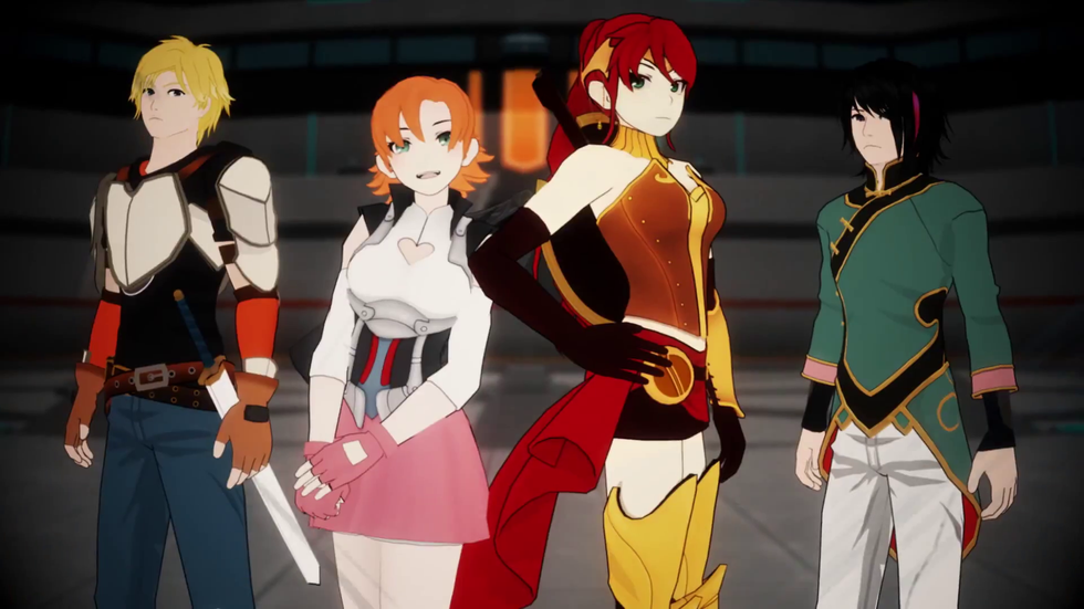 From left to right: Jaune Arc, Nora Valkyrie, Pyrrha Nikos, Lie Ren