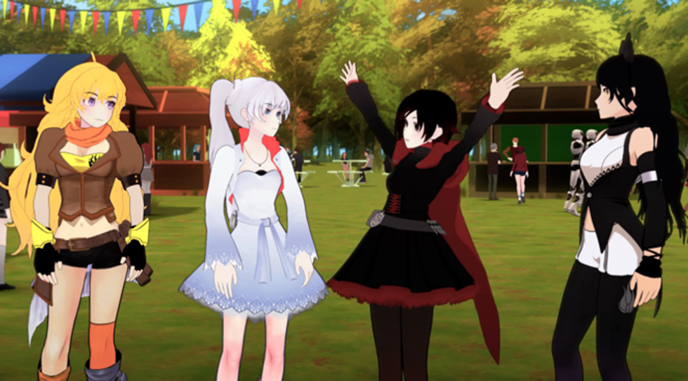 From left to right: Ruby Rose, Weiss Schnee, Blake Belladonna, Yang Xiao Long