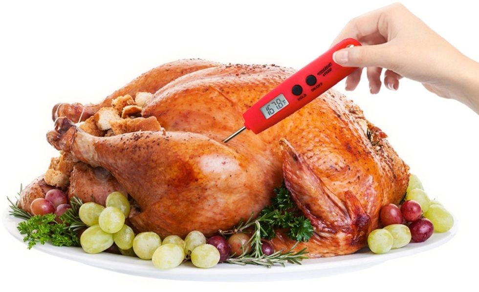 Ah, the biggest question. 450 degrees for 3 hours, 350 for 4 hours, till it's golden brown, "is it okay if it's this color?" just how do you know if the turkey is not going to make you sick? For this, it's all up to the internal temperature, then it's just gravy from there. (You can cook it however much longer you want, this is just the minimum to make sure it's safe.) To start your food safety assurance, get yourself a food thermometer.