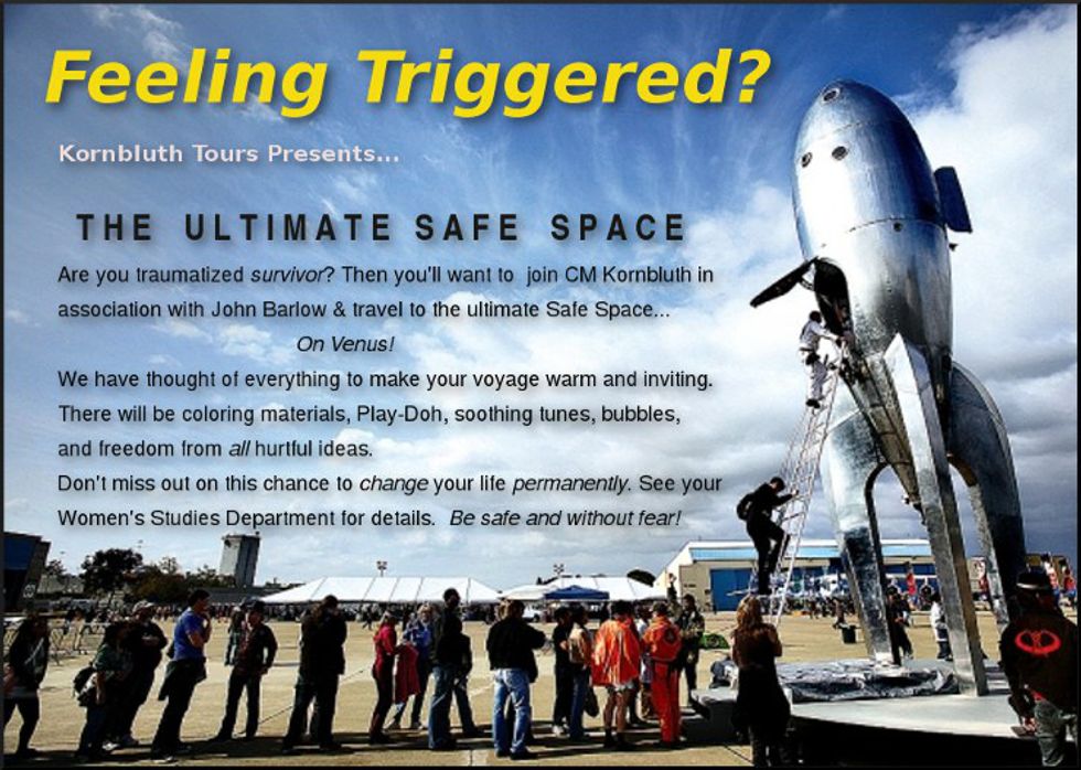 Another contribution to the issue are “safe spaces.” These places are meant to be where students can feel “safe” to express themselves without fear of being judged, ridiculed, etc. The main problem with that is what is “safe” to one person does not mean “safe” to another. What if I write a poem that someone may deem offensive and say it in a safe space because I feel “safe” to recite it? Then someone in that space gets offended by it, whose “safety” comes first? Safe spaces are one of the most selfish ideas on campus. When someone says they support safe spaces, they are supporting a safe space for themselves, not for everyone.