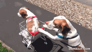 This wacky pup learned to walk on two legs just to push his pal around. You know he was not built to walk like that!