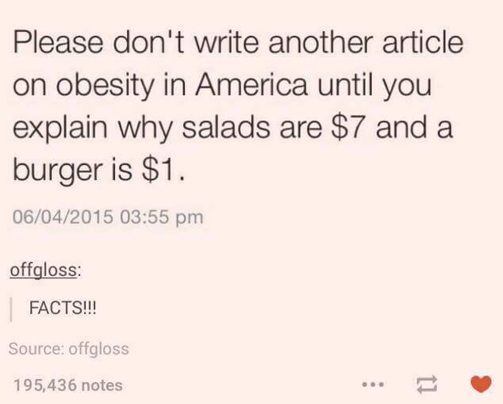 “Please don’t write another article on Obesity in America until you explain why salads are $7 and a burger is $1,” exclaimed the biting Tumblr screenshot. While the meme exaggerates for the purpose of humor-- a hamburger costs a little more than a dollar and salads are not always healthy--it touches on a critical issue: obesity, especially among lower income families.