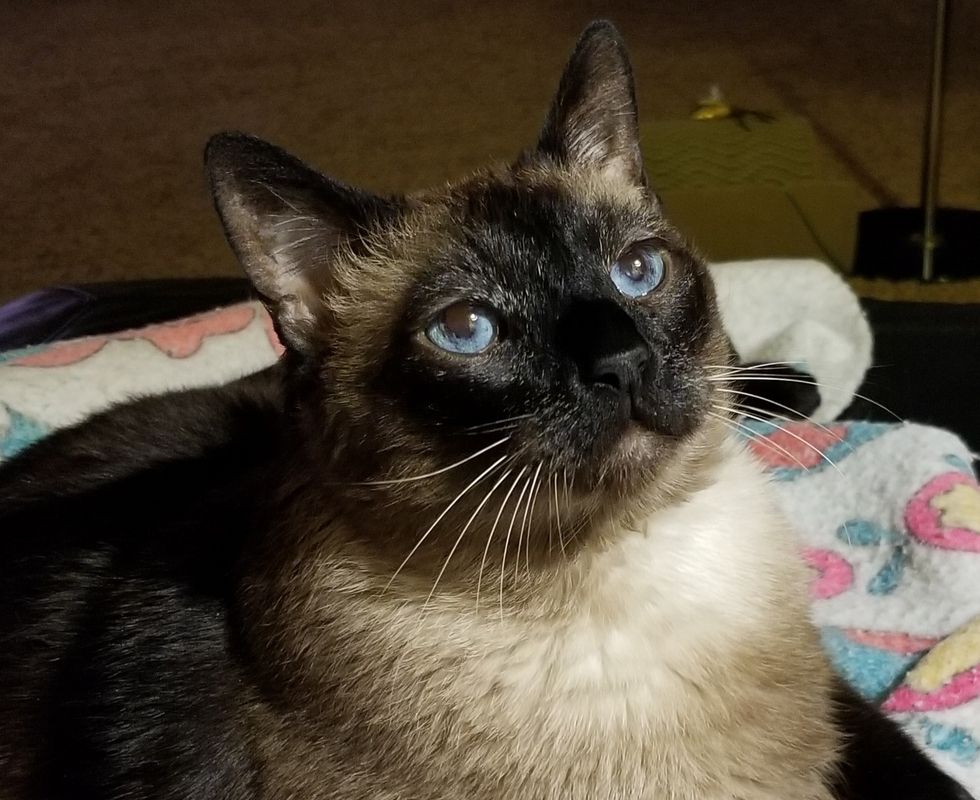 1. Sam is actually a purebred Siamese. He is a tad dark but that's because his parents were registered as two different classifications of Siamese cats. His dad was a Chocolate point, and his mom was a Seal point. Because he's so dark, Sam was classified as a Burmese-Siamese even though cross-breeding didn't take place- Siamese cats just get darker as they get older and/or gain weight.