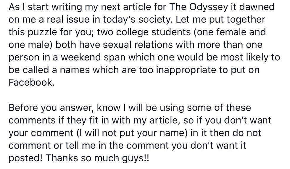 A male and female have the same amount of sexual partners but at the end of the day who gets called a slut? The male? The worst he gets called is a man whore. But the female, she is the one who gets called a slut. For what reason? Women get called this name for completely invalid reasons like using the puppy filter on Snapchat or God forbid our bra strap showing. Just because women have the same number of sexual partners as men does not give anybody the right to call us a slut.