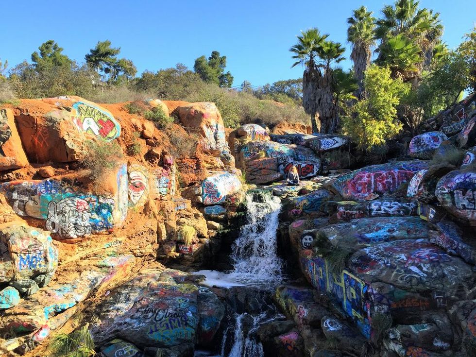 Located in Mission Valley is an incredibly unique waterfall that is covered in graffiti, quite close to the campus of San Diego State.