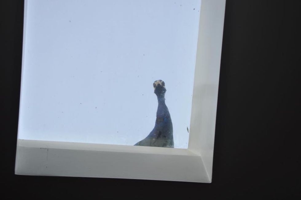 Do you ever feel lonely? Don't fret, peacocks are always with you! This peacock is checking in from a skylight, he just wants to see what's up (besides him being on your roof)!