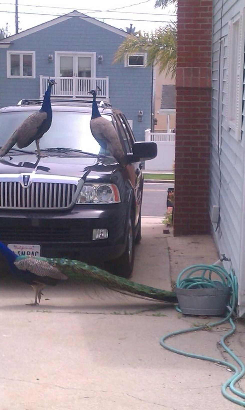 Can't get in the Carpool lane for your commute to DTLA? Bring a peacock with you, they LOVE cars. Here you can see 3 peacocks checking on your car, while they may peck at their reflection in your paint, you will at least know your car was clean!