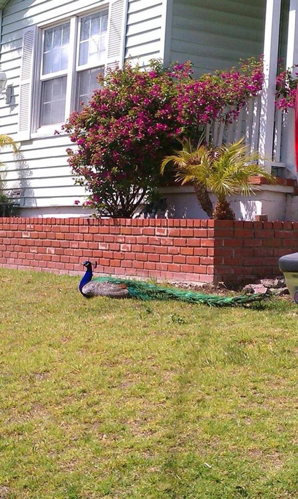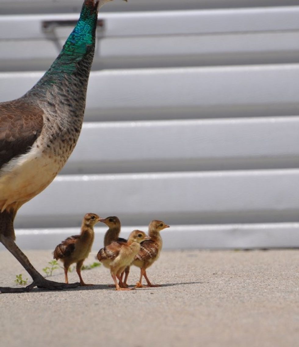 During the spring and early summer, you will see peahens walking around with their peachicks, truly a site to see. Hopefully your house was not chosen to lay eggs., peahens lay on their eggs for 28 days. Some residents report crows coming down to eat the eggs if the peahens abandon them creating a huge disgusting mess…