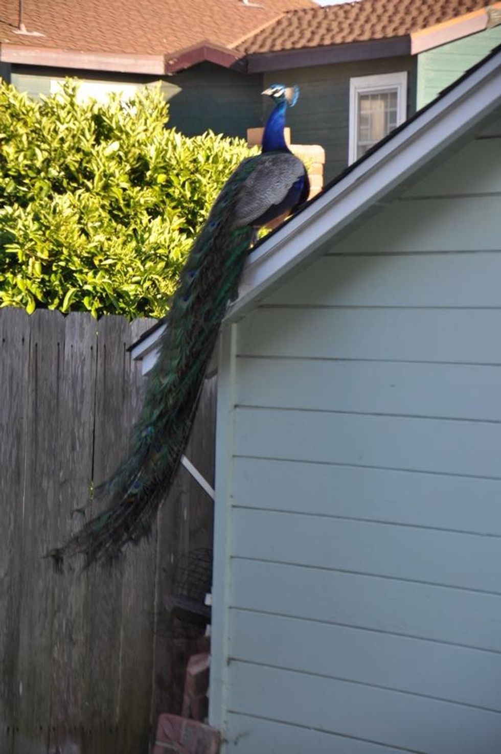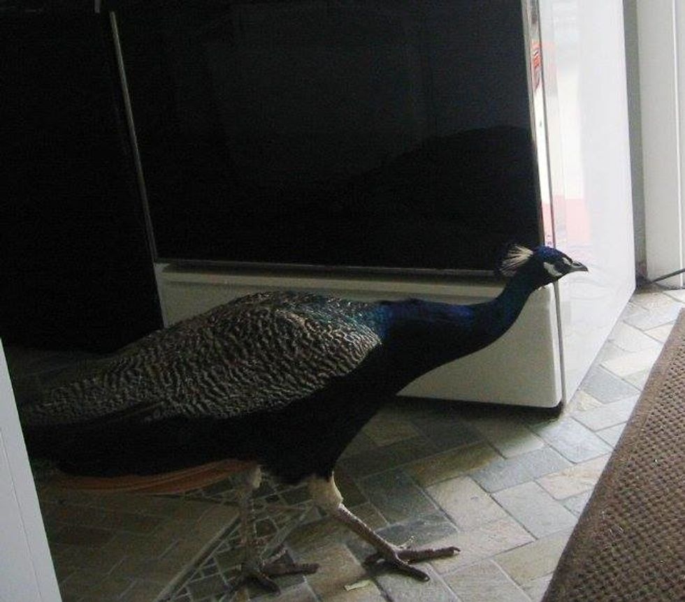 Peacocks love to invite themselves in. this peacock was running a bit late but let itself in through the back door. San Pedro residents have reported peafowl walking into their homes. Whether it is your kitchen or garage, nowhere is safe!