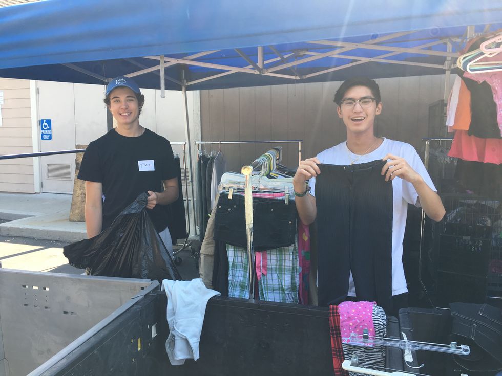 First-year students Tim (left) and Michael (right) helping sort clothes at Sacred Heart Community Service