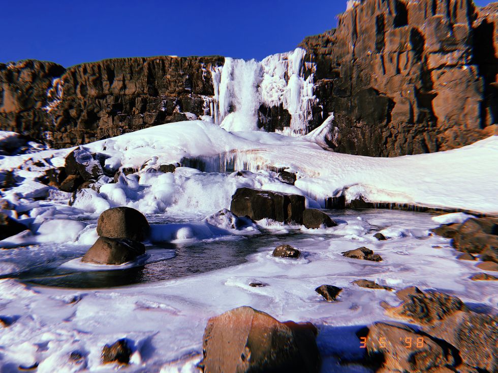 And this right here, this is the spot where the North American and European tectonic plates meet: the Mid-Atlantic Ridge. Located in Þingvellir National Park, I walked along the plate boundary of my own country, and one foreign. I was standing on two continents at once, which created a rigged wall of sturdy rock, with frozen waterfalls and pounding streams flowing down and along its boundaries. I guess this is what the ancient history of the formation of our world looks like. It is breathtaking.